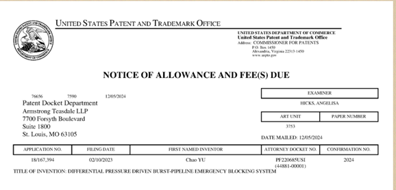Sichuan Hejia High-Tech Research Institute Had Granted a U.S Potent Through Inventing DIFFERENTIAL PRESSURE DRIVEN BURST-PIPELINE EMERGENCY BLOCKING SYSTEM.